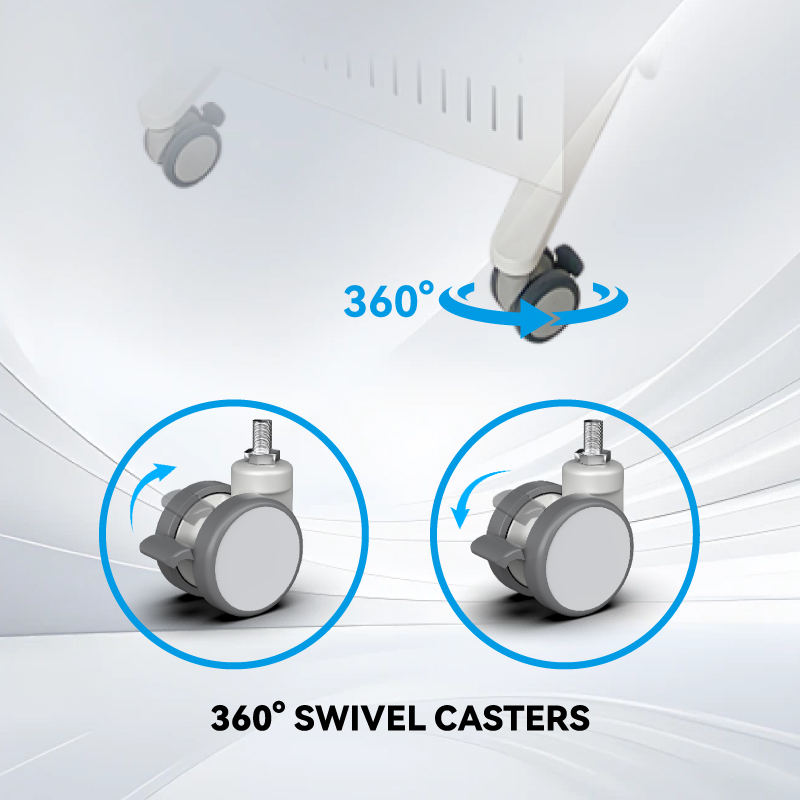عربة ليكايمو للكمبيوتر المحمول مزودة بأربع عجلات دوارة بزاوية 360 درجة، قطرها 3 بوصات، مزودة بفرامل تُفعّل بالقدم لضمان سلاسة الحركة وثبات الوضع. تتخطى العجلات الكبيرة بسهولة عتبات الأرضيات والسجاد، مما يوفر سهولة في المناورة على مختلف أنواع الأرضيات في العيادات والمستشفيات وصالونات التجميل. بفضل هيكلها المتين، تحافظ العربة على ثباتها أثناء الاستخدام، وتضمن عجلاتها القابلة للقفل ثباتها في مكانها عند الثبات.