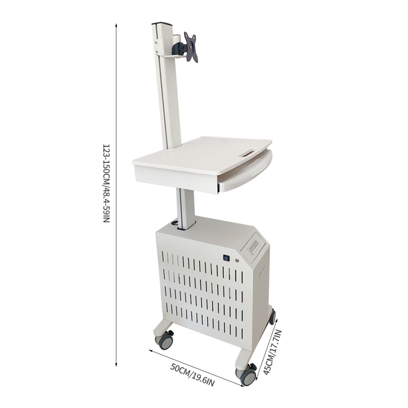 تتميز هذه العربة الطبية بعمود قابل لتعديل الارتفاع، يدعم شاشة رقمية لمراقبة بيانات المرضى بشكل فوري. يتضمن تصميمها الانسيابي لوحة مفاتيح منزلقة وقاعدة متحركة متينة مزودة بعجلات قابلة للقفل لتسهيل التنقل السريري.