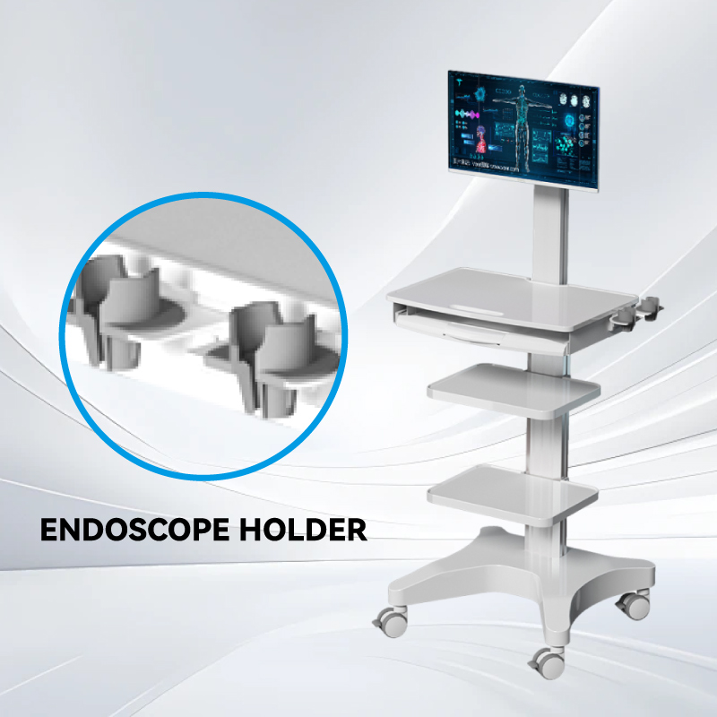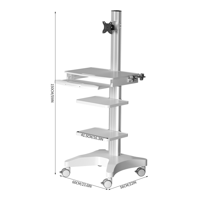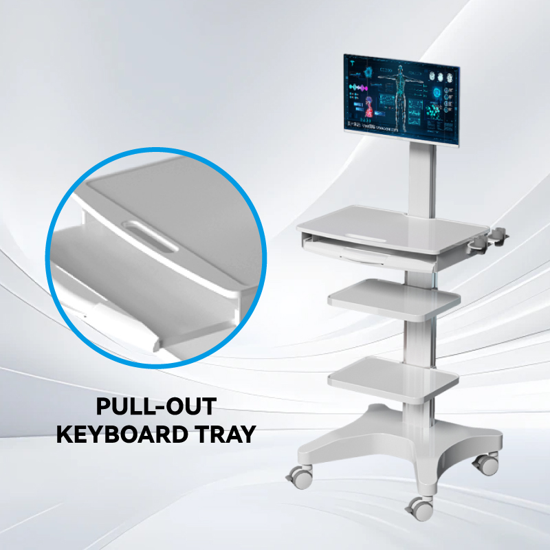 تتميز هذه العربة الطبية بعمود قابل لتعديل الارتفاع، يدعم شاشة رقمية لمراقبة بيانات المرضى بشكل فوري. يتضمن تصميمها الانسيابي لوحة مفاتيح منزلقة وقاعدة متحركة متينة مزودة بعجلات قابلة للقفل لتسهيل التنقل السريري.