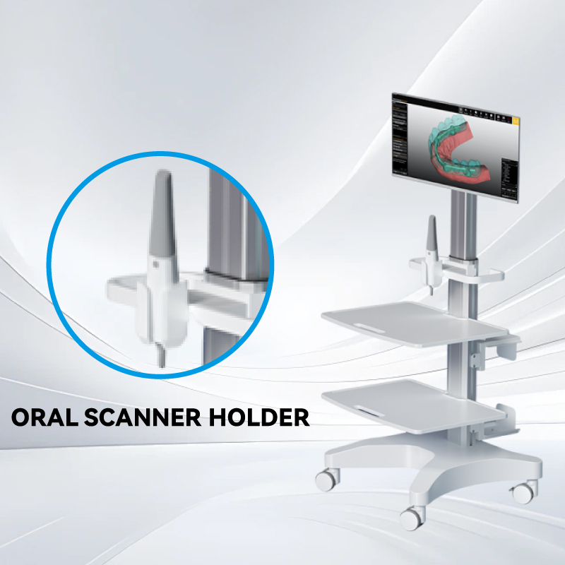 يتميز حامل الماسح الضوئي الفموي بقاعدة مريحة وسريعة الفك تُثبّت عصا الماسح الضوئي بإحكام أثناء فترات التوقف. تصميمه المائل يسمح بالوصول الفوري بيد واحدة، بينما يمنع نظام إدارة الكابلات المدمج التشابك. مصنوع من بوليمر طبي، ويدعم تكاملاً سلسًا لسير العمل بفضل قاعدته المُخفّضة للاهتزاز. يحافظ الحامل على نظافة الماسح الضوئي وجاهزيته للشحن بين الإجراءات.