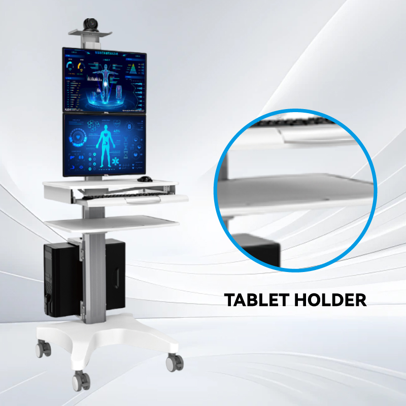 تتميز عربة التقريب الذكية بشاشتين لمراجعة البيانات بكفاءة، ولوحة مفاتيح قابلة للسحب لسهولة الإدخال، وصينية متعددة الاستخدامات للأدوات الطبية، مما يعمل على تبسيط سير العمل السريري في نقطة الرعاية.