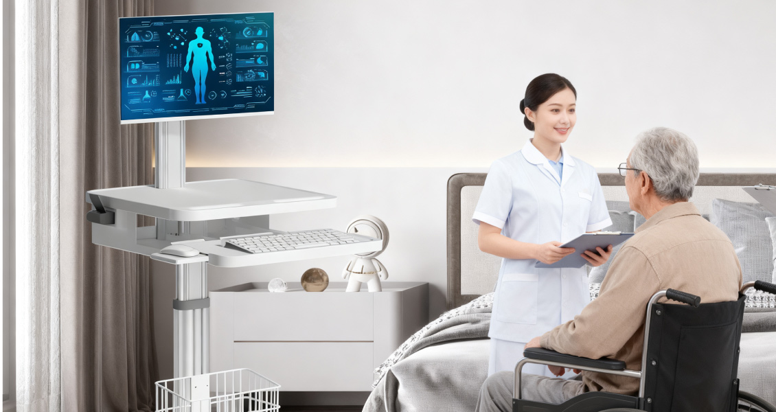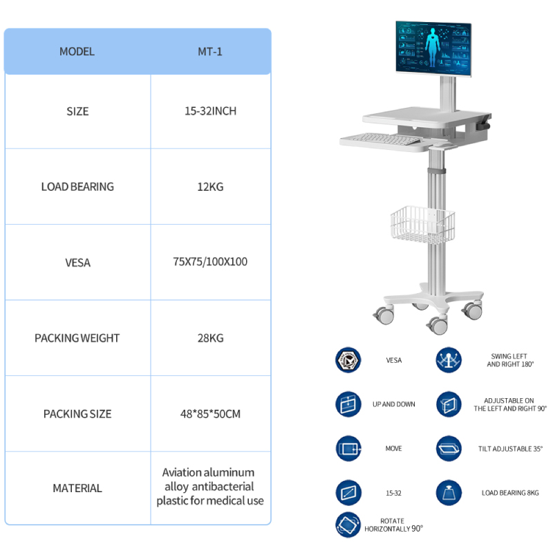 تتميز هذه العربة الطبية بعمود قابل لتعديل الارتفاع، يدعم شاشة رقمية لمراقبة بيانات المرضى بشكل فوري. يتضمن تصميمها الانسيابي لوحة مفاتيح منزلقة وقاعدة متحركة متينة مزودة بعجلات قابلة للقفل لتسهيل التنقل السريري.