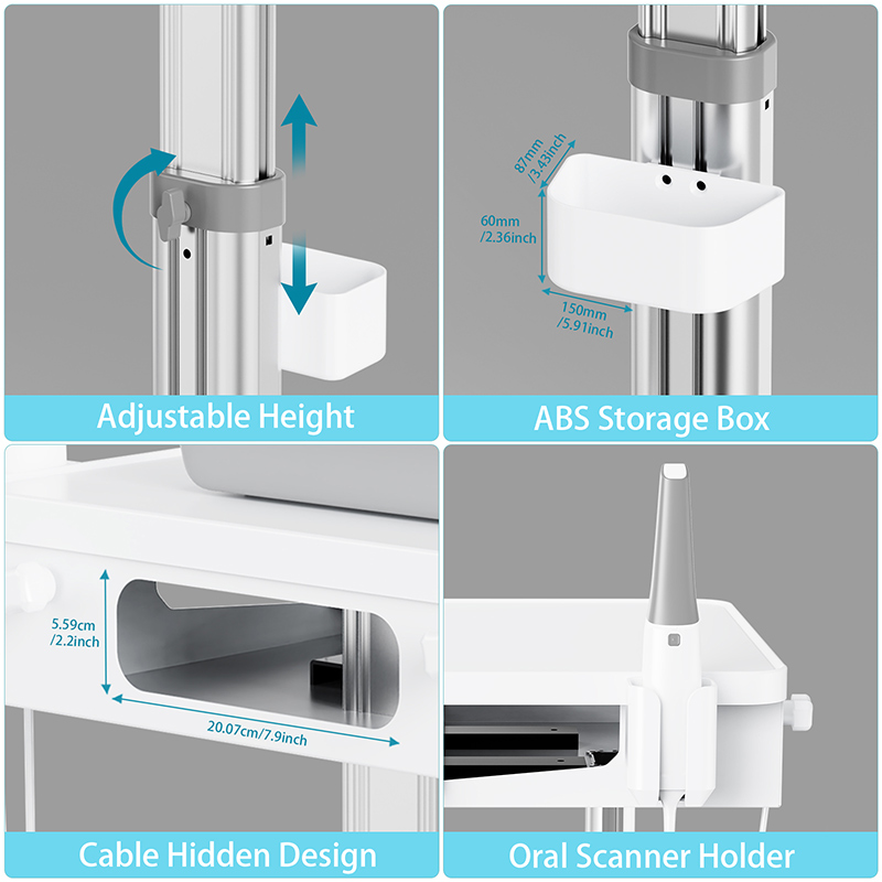صُممت هذه العربة خصيصاً لعيادات الأسنان، وتُعدّ محطة عمل متنقلة أساسية لإجراء المسح الضوئي داخل الفم والتشخيص. يستطيع أطباء الأسنان تحريك العربة بسهولة إلى أماكن جلوس المرضى، ووضع أجهزة المسح الضوئي الفموية وأجهزة الكمبيوتر المحمولة لالتقاط البيانات الفموية بسرعة، مما يجعلها أداة لا غنى عنها في عمليات ترميم الأسنان الرقمية وتقويم الأسنان.
