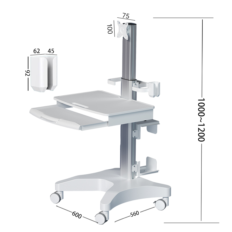 إنها عربة طبية متنقلة حديثة تتميز بشاشة كبيرة قابلة للتعديل، ودرج لوحة مفاتيح قابل للسحب، وحامل مخصص لجهاز المسح المحمول.