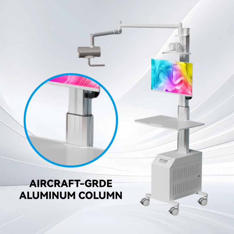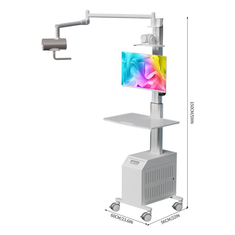 عربة طبية قابلة لتعديل الارتفاع مع ذراع هوائي يسمح بحرية الحركة والدوران في جميع الاتجاهات ومجهزة بحامل ماسح ضوئي داخل الفم.