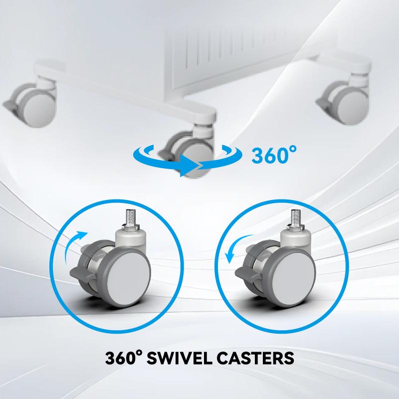 عربة ليكايمو للكمبيوتر المحمول مزودة بأربع عجلات دوارة بزاوية 360 درجة، قطرها 3 بوصات، مزودة بفرامل تُفعّل بالقدم لضمان سلاسة الحركة وثبات الوضع. تتخطى العجلات الكبيرة بسهولة عتبات الأرضيات والسجاد، مما يوفر سهولة في المناورة على مختلف أنواع الأرضيات في العيادات والمستشفيات وصالونات التجميل. بفضل هيكلها المتين، تحافظ العربة على ثباتها أثناء الاستخدام، وتضمن عجلاتها القابلة للقفل ثباتها في مكانها عند الثبات.