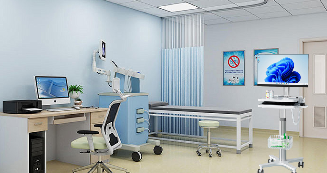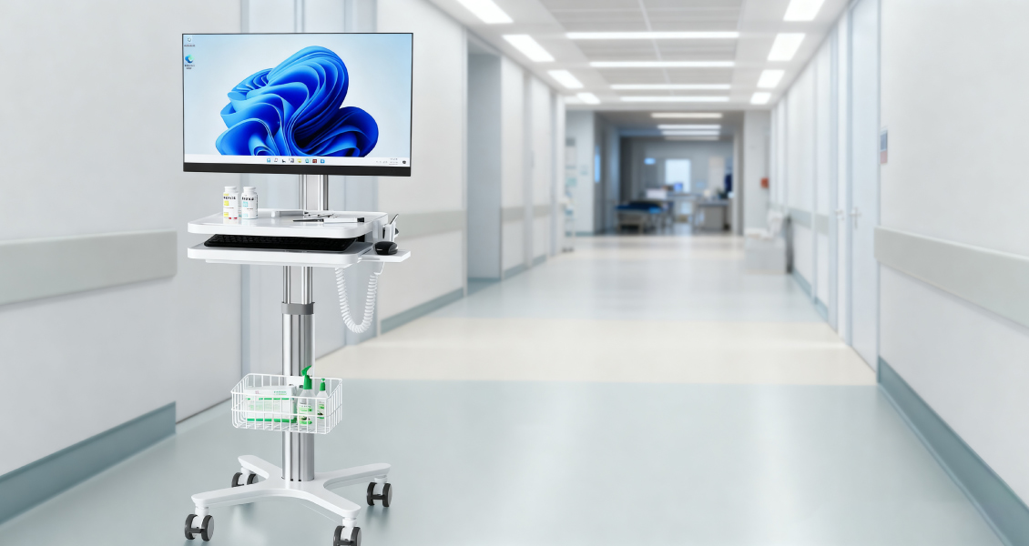 تتميز هذه العربة الطبية بعمود قابل لتعديل الارتفاع، يدعم شاشة رقمية لمراقبة بيانات المرضى بشكل فوري. يتضمن تصميمها الانسيابي لوحة مفاتيح منزلقة وقاعدة متحركة متينة مزودة بعجلات قابلة للقفل لتسهيل التنقل السريري.