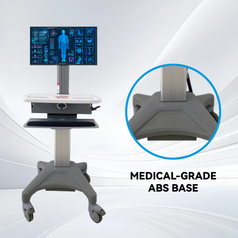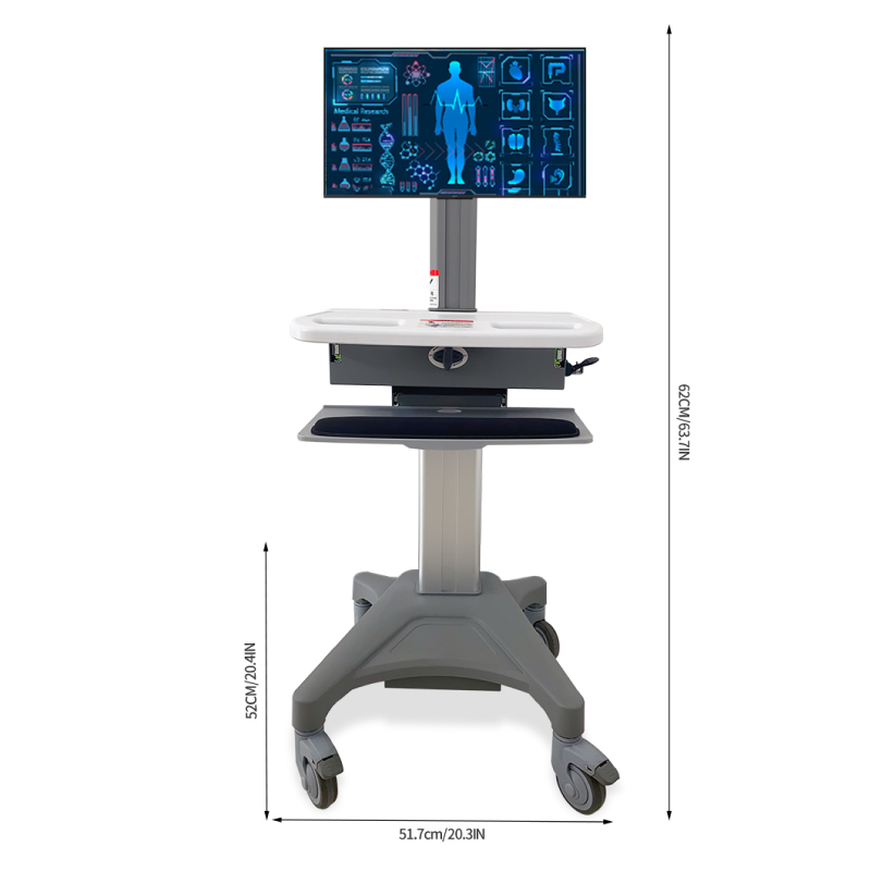 تتميز هذه العربة الطبية بعمود قابل لتعديل الارتفاع، يدعم شاشة رقمية لمراقبة بيانات المرضى بشكل فوري. يتضمن تصميمها الانسيابي لوحة مفاتيح منزلقة وقاعدة متحركة متينة مزودة بعجلات قابلة للقفل لتسهيل التنقل السريري.