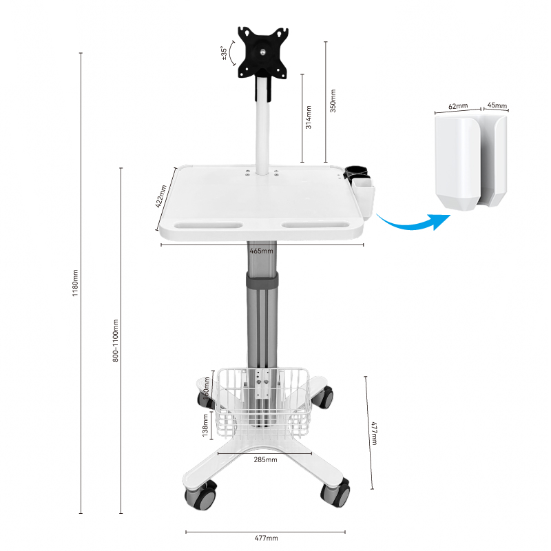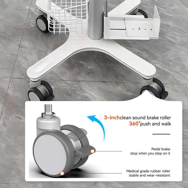 تدعم طاولة العمل الواسعة، بقياس 465×422 مم، حمولة قصوى تصل إلى 30 كجم، وتستوعب بثبات أجهزة متعددة مثل الشاشات ولوحات المفاتيح والفأرات وأجهزة المسح الضوئي داخل الفم في آن واحد. كما يساهم تصميم الحافة المقاومة للسقوط وفتحات الكابلات المخصصة في تنظيم الكابلات بكفاءة، مما يوفر مساحة تشخيص وعلاج متنقلة نظيفة ومنظمة.